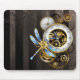Marcações antigas com engrenagens de ouro e latão, decoradas com libélula mecânica sobre fundo castanho e listrado. Steampunk.