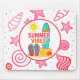 Uma design de verão divertida com uma prancha de surfe, chinelos, conchas, um sol brilhante e a frase "Víblias de Verão" sobre uma praia arenosa.