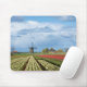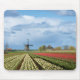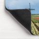 Mousepad com uma paisagem com um moinho de vento e umas tulipas amarelas e vermelhas sob um céu nebuloso no campo holandês em um dia bonito da primavera na região do bulbo, os Países Baixos.