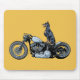 Um Pinscher do Doberman que senta-se em uma motocicleta do bobber. Os t-shirt, suam, ganhos do presente da novidade.