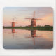 Mousepad da foto com dois moinhos de vento ao longo de um rio com reflexão na água imóvel na luz do por do sol em uma noite do verão nos Países Baixos.