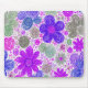 Flores vibrantes em tons roxos, cor-de-rosa, azuis e verdes são dispostas em um padrão balançado