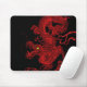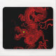 Um dragão chinês vermelho do sangue com olhos amarelos contra um fundo preto.