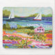 Dois veleiros e algodão I por Karen Fields. Cena brilhante, divertida com flores, árvores, um chalé e veleiros na água.