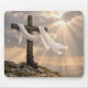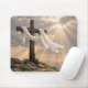 A wooden cross wrapped in white fabric stands on a rocky hill, bathed in warm sunlight that pierces through the clouds