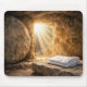 Sunlight pours into a stone tomb, illuminating a folded white cloth on a rocky surface while the entrance, framed by large stones, creates a calm contrast between light and shadow.