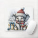 Elefante giro se senta vestindo um chapéu confortável e cachecol listrado, cercado por caixas de presentes e galhos de neve