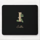 O mouse preto elegante apresenta um monograma botânico dourado no centro.