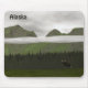 Uma pintura digital de coníferas verdes e montanhas no Alasca em um dia muito cinza e nublado. Um alce no primeiro plano dá escala para a cena. O texto personalizável lendo "Alaska" também é exibido.