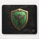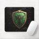 Tampo de mouse majestoso com uma águia dourada contra um escudo de cristal esmeralda verde brilhante. Características incluem filigrana ornamentada e texturas rachadas realistas em uma superfície preta de mármore texturizado com veias douradas premium. Projetado para amantes de fantasia e configurações de mesa de jogos temáticas da natureza.