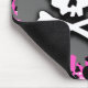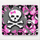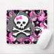 Este Mouse Pad apresenta uma imagem gráfica de cor rosa, preta, cinza e pintura branca, crânio e ossos.