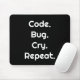 Perfect for programmers and tech enthusiasts 💻 this sleek mouse pad features "Code. Bug. Cry. Repeat." in bold white on a stylish black background ✨ Simple, modern, and relatable, a design that captures every coding session 🎁 Ideal gift for anyone who loves programming, debugging, or all things tech 🖱️ Comfortable & durable, smooth surface for precise mouse movements built for daily use 💡 A witty and thoughtful gift for developers, engineers, and tech lovers alike.