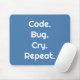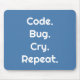 Perfect for programmers and engineers 💻 this sleek mouse pad features "Code. Bug. Cry. Repeat." in bold white on a stylish Sky Blue background ✨ Modern, eye-catching, and relatable, a design that inspires every coding or engineering session 🎁 Ideal gift for anyone who loves programming, debugging, or all things tech 🖱️ Comfortable & durable, smooth surface for precise mouse movements built for daily use 💡 A witty and thoughtful gift for developers, engineers, and tech lovers alike.