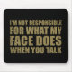 Se você gosta de citações sarcásticas engraçadas ou designs humorísticos excelentes, este slogan original "Eu não sou responsável pelo que meu rosto faz quando você fala" é para você. É um presente excelente para sua família, amigos ou para você mesmo! Esta design é ideal para quem ama sarcasmo e humor. Se você gosta dessa citação engraçada, veja trabalhos de arte mais parecidos na loja Omitay. Fique seguro e obrigado você por apoiar um artista local.