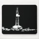 Um equipamento de perfuração para a exploração do petróleo na silhueta branca em um fundo preto.