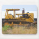 Escavadora modelo mais velha que senta-se em um pasto com uma construção da lata no fundo.