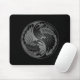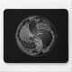 Estas características de design pretas e cinzentas de yang do yin dois escorpião estilizados. Cada aracnídeo curva-se em torno da borda da gota do rasgo com ela é stinger que ondula para trás para o corpo. Os pincers dos escorpião são guardarados apenas acima da cabeça e é pés é esticado para fora em uma pose agressiva. Este teste padrão à moda é um exemplo impressionante deste símbolo tradicional para o equilíbrio da natureza.