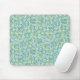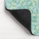 Este mouse pad tem um design Boho de espirais sobrepostas em azul e verde em um campo de branco.