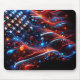 Uma representação vibrante da bandeira americana apresenta padrões giratórios de vermelho, branco e azul, com estrelas colocadas sobre um fundo dinâmico