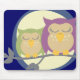 As corujas bonitos do estilo do kawaii empoleiraram-se em um ramo com a lua no fundo.