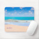 Uma bela praia tropical com as palavras "eu aqui". Personalize com o seu texto. Água turquesa e areia branca, dedos na areia, felicidade total das férias.
