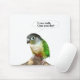 Neste lindo bocal, uma conura de bochecha verde é mostrada perguntando, "Eu posso falar, você pode voar?"