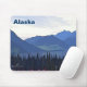 Montanhas azuis, água azul do lago, árvores verdes escuras, algas rosa e encharcadas. Uma representação do verão no extremo norte. A leitura de texto "Alaska" também é exibida. Mosquitos não incluídos.
