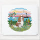 Um rei Blenheim Cavalier Charles Spaniel desfruta de um belo dia na costa com um farol na costa e um veleiro a planar ao longo da água azul clara. Um pássaro azul canta em um galho como uma gaivota.