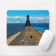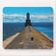Um longo quebra-mar estende-se pela água em direção a um farol distante, conduzindo o olhar ao longo de sua superfície desgastada. O contraste entre o concreto texturizado, a água aberta e o céu cria uma forte sensação de direção e profundidade.