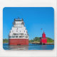 Um grande cargueiro atravessa a água perto de um farol vermelho brilhante do Michigan sob um céu azul claro