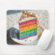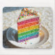 Um bolo de arco-íris vibrante com seis camadas coloridas é tocado com glacé branco e borrifadas