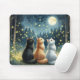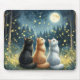 Cenas fantásticas de três amigos felinos a balançar-se à luz da lua, cercados por céus noturnos brancos.