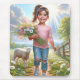 Menina bonita andando pelo caminho da terra e segurando flores. O cordeiro branco está a segui-la.