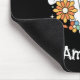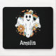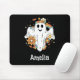 Mousepad com uma ilustração de um fantasma sorridente. Decorado com flores, arco-íris e morcegos.