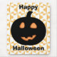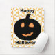 O jack-o-lanterno feliz do Halloween se senta sobre um padrão personalizado de formas de giro de abstrato.