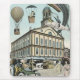Ilustração antiga de viagem e transporte com imagem futurista de ficção científica, apresentando pessoas viajando de dirigíveis, balões de ar quente, um trem invertido e um automóvel conversível antigo em uma cena urbana retrô de metrópole steampunk vitoriana.