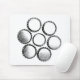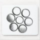 Uma imagem preto e branco do estilo do esboço de diversos prateia os bonés de garrafa da cerveja do metal arranjados em um design da flor com um centro e as pétalas.