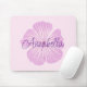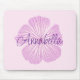 Uma flor rosa-solteiro de Lavatera floresce em fundo rosa pálido com o seu próprio nome numa letra roxa escrita.