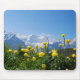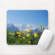 Esta incrível foto do Getty Images mostra a paisagem do campo com flores amarelas nos Alpes suíços em frente às famosas montanhas Eiger Monch Jungfrau perto de Grindelwald e Interlaken.
