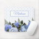 Mousepad elegante e na moda com flores azuis poeirentas e folhas verdes sobre bolinhas azuis. Personalizado com seu nome