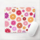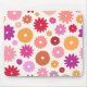 Padrão de flores coloridas em amarelo, laranja, rosa, lilás e vermelho em um fundo de cor creme.