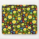 Um mouse pad com um padrão contínuo detalhado composto por muitas flores desenhadas à mão em muitas cores.