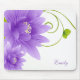 Flores roxas monogramas com folhas verdes sobre fundo branco. Modelo do mouse pad personalizável