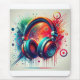 Fones de ouvido coloridos retratados em um estilo artístico vívido com um fundo abstrato de respingos evocando música e criatividade.
