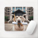 Um cão ouro que veste um boné de formatura, orgulhosamente, tem um diploma na boca, em frente a uma escola com janelas e degraus