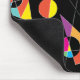 Mousepad, com formas geométricas abstrato coloridas sobre fundo preto.