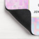 Um mouse pad com um padrão de fundo abstrato. As aquarelas roxas e azuis cor-de-rosa formam este design artístico que apresenta formas retangulares verticais sobre um fundo malhado. Um quadrado em camadas acima com uma borda falsa de folha de ouro, seu dentro de texto personalizado.