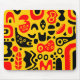 Um tapete do rato com um design abstrato incomum compo de formas surreais estranhas no vermelho e no preto. Inspirado pelo design moderno retro.