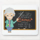 design legal e engraçada com professor de ciência segurando um frasco de Química e um bastão apontando o quadro-negro com a fórmula EMC2 e várias outras fórmulas.