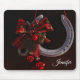 Um mouse pad com uma foto com uma ferradura enforcada adornada com uma fita de xadrez de búfalo e decorações de Natal.
